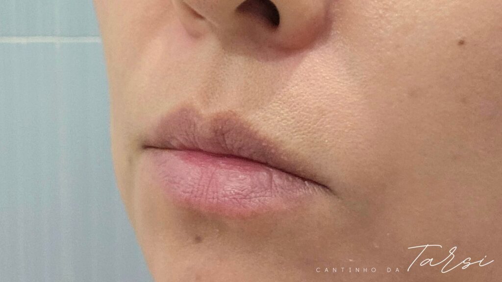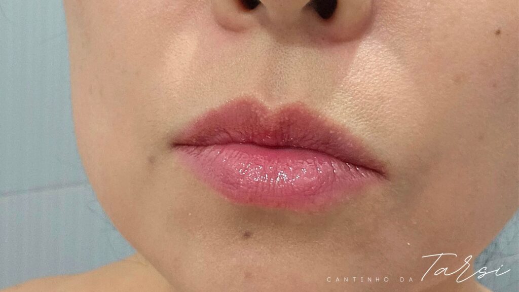 Nos lábios, senti que a textura é leve, não fica grudenta e traz um brilho delicado com um toque de cor que apenas ressalva a cor natural dos meus lábios. A fragrância de cereja é delicada e sutil, eu que não gosto de cheiros consigo usar tranquilamente. Além disso, percebi que os lábios ficam hidratados por bastante tempo, o que é ótimo para o uso diário.